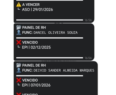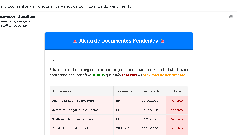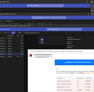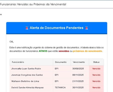 Um dos principais diferenciais do sistema é a automação de alertas por e-mail, enviados de forma programada para sinalizar documentos próximos do vencimento ou já vencidos. Essa funcionalidade reduz significativamente o risco de não conformidade, elimina controles manuais ineficientes e garante tempo hábil para renovação e regularização da documentação, contribuindo diretamente para a segurança operacional da empresa.