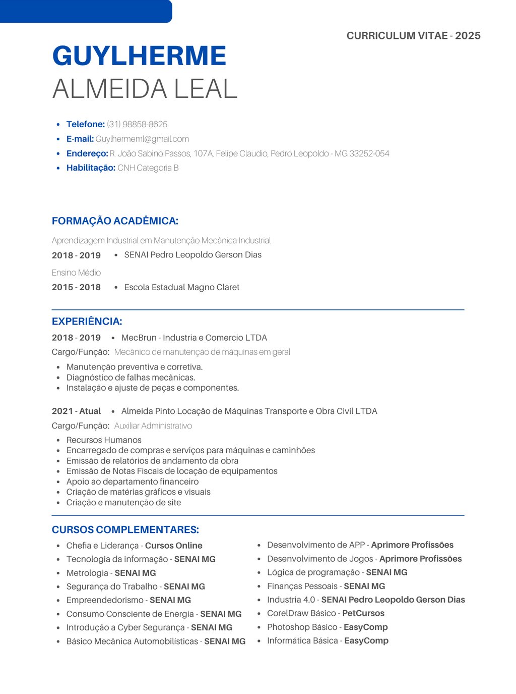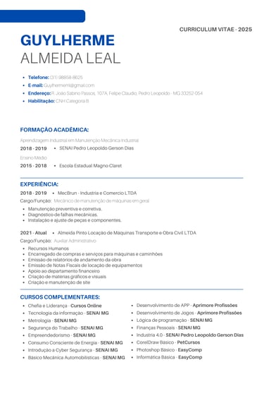Atualmente, estou em pleno exercício na Almeida Pinto Locação de Máquinas e Equipamentos LTDA, mas estou sempre em busca de novos desafios que me permitam evoluir e expandir minha carreira profissional. Ao longo da minha trajetória, desenvolvi uma base sólida com formação técnica em Manutenção Mecânica Industrial e uma ampla experiência em áreas como manutenção de máquinas, administração e criação de conteúdo digital.